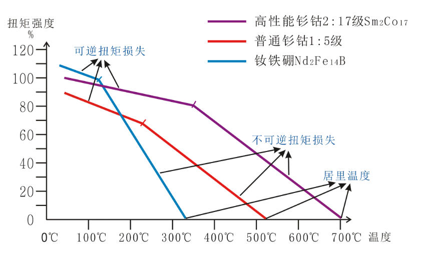 當(dāng)溫度超350℃,高性能釤鈷材質(zhì)的磁鋼將會進入不可逆扭轉(zhuǎn)損失。