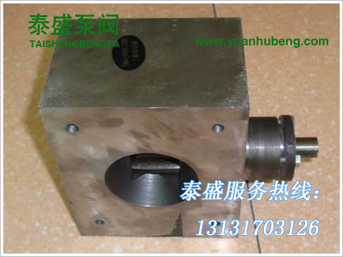 屬于正位移泵,工作時(shí)依靠主、從動(dòng)齒輪的相互嚙合造成工作容積變化來(lái)輸送熔體。工作容積由泵體、齒輪的齒槽及具有側(cè)板功能的軸承套構(gòu)成。當(dāng)齒輪旋轉(zhuǎn)時(shí),熔體即進(jìn)入吸入腔兩齒輪的齒槽中,隨著轉(zhuǎn)動(dòng),熔體從兩側(cè)被帶入排出腔,齒輪再度嚙合,使齒槽中的熔體被擠出排出腔,壓送到出口管道。軸承不能使用通常的潤(rùn)滑油脂,以避免污染熔體,通常采用熔體自潤(rùn)滑。