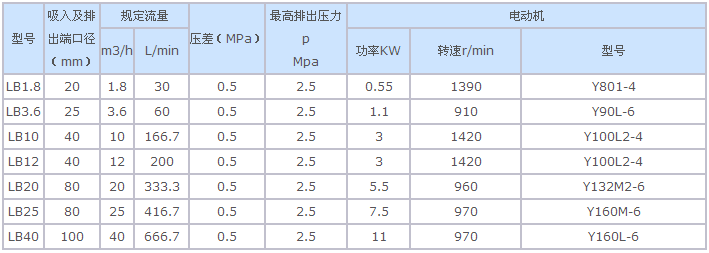 LB型冷凍機(jī)用齒輪泵性能參數(shù)及配套電機(jī):