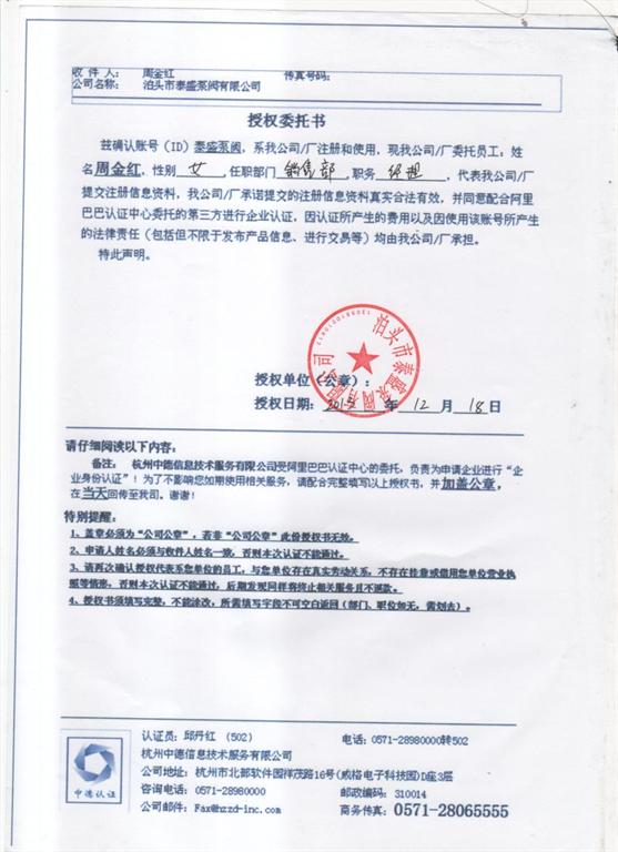 泰盛泵閥公司為了更進一步打造出自己的“齒輪泵行業(yè)_泰盛”品牌。在2014年12月19日通過了阿里巴巴第三方的企業(yè)身份認(rèn)證,認(rèn)證中心對我公司提交的的所有泰盛泵閥資料信息合法有效。這是泰盛公司加蓋公章并簽字的認(rèn)證書合同。